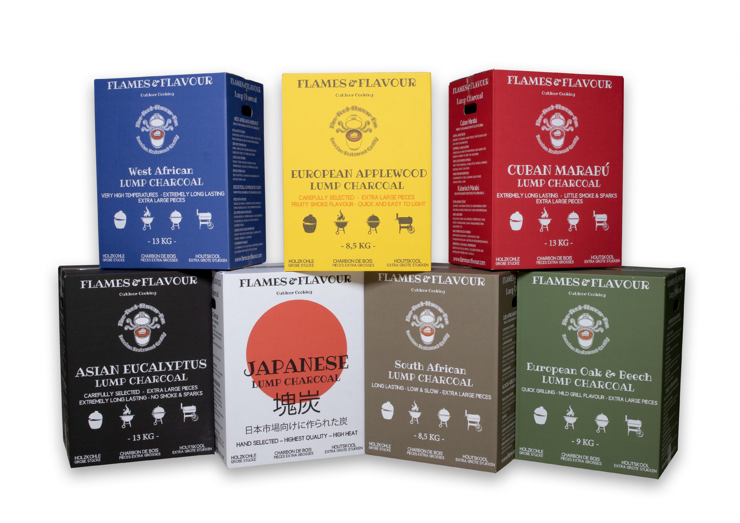 Flames & Flavour houtskool kent vele verschillende soorten kamado houtskool. Allemaal verpakt in handige dozen om de stukken houtskool groot te houden tijdens het vervoer en opslag.