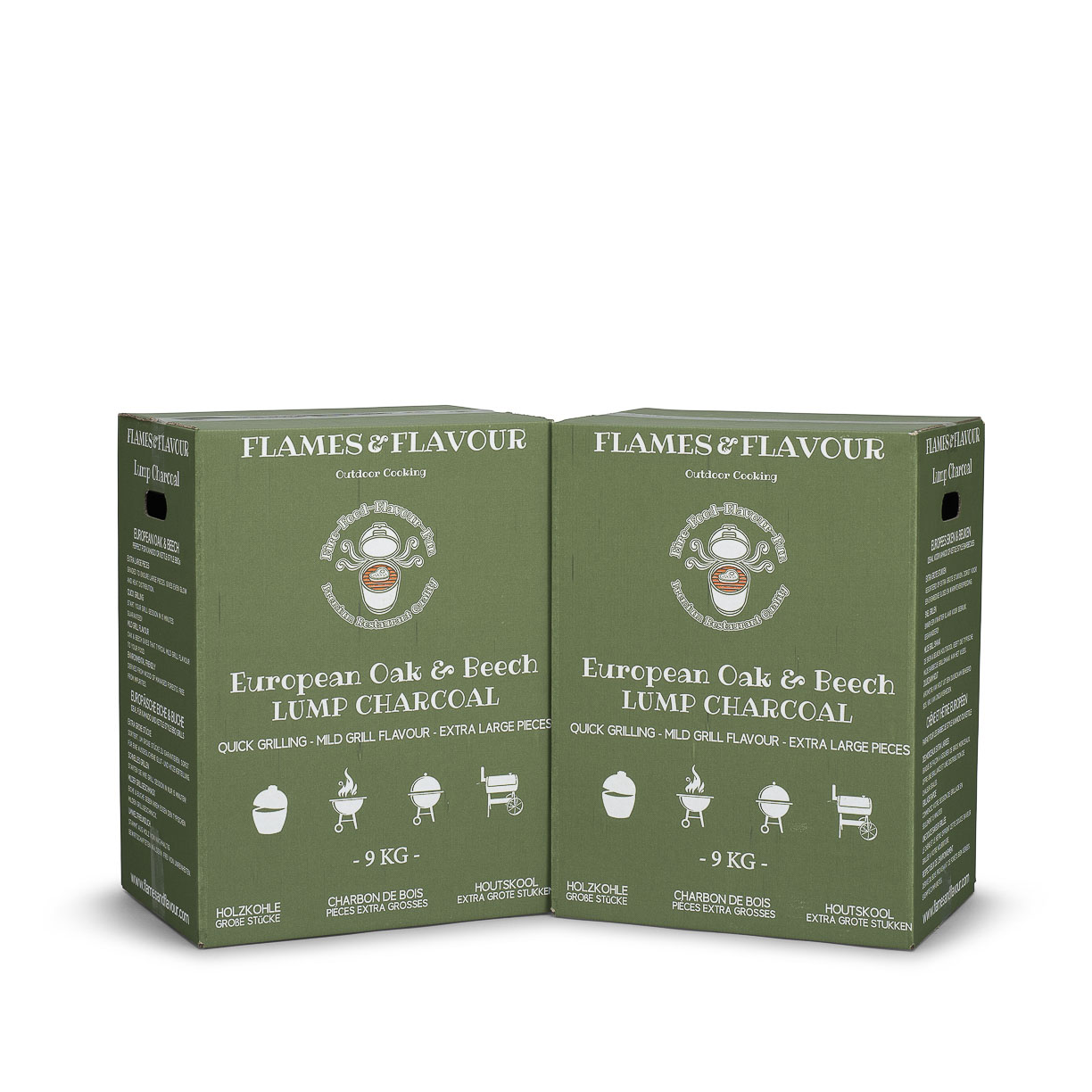 Deze soort houtskool is gemaakt van Europees eiken en beukenhout. De eigenschappen van deze soort houtskool zijn absoluut vergelijkbaar met Oak (eik) & Hickory houtskool. Het brandt net zo efficient en geeft heel weinig as. Ook Flames & Flavour houtskool is 100% organisch. Omdat de houtskool uit Europa komt en transport beperkt blijft krijg je een uitstekende prijs – kwaliteit.