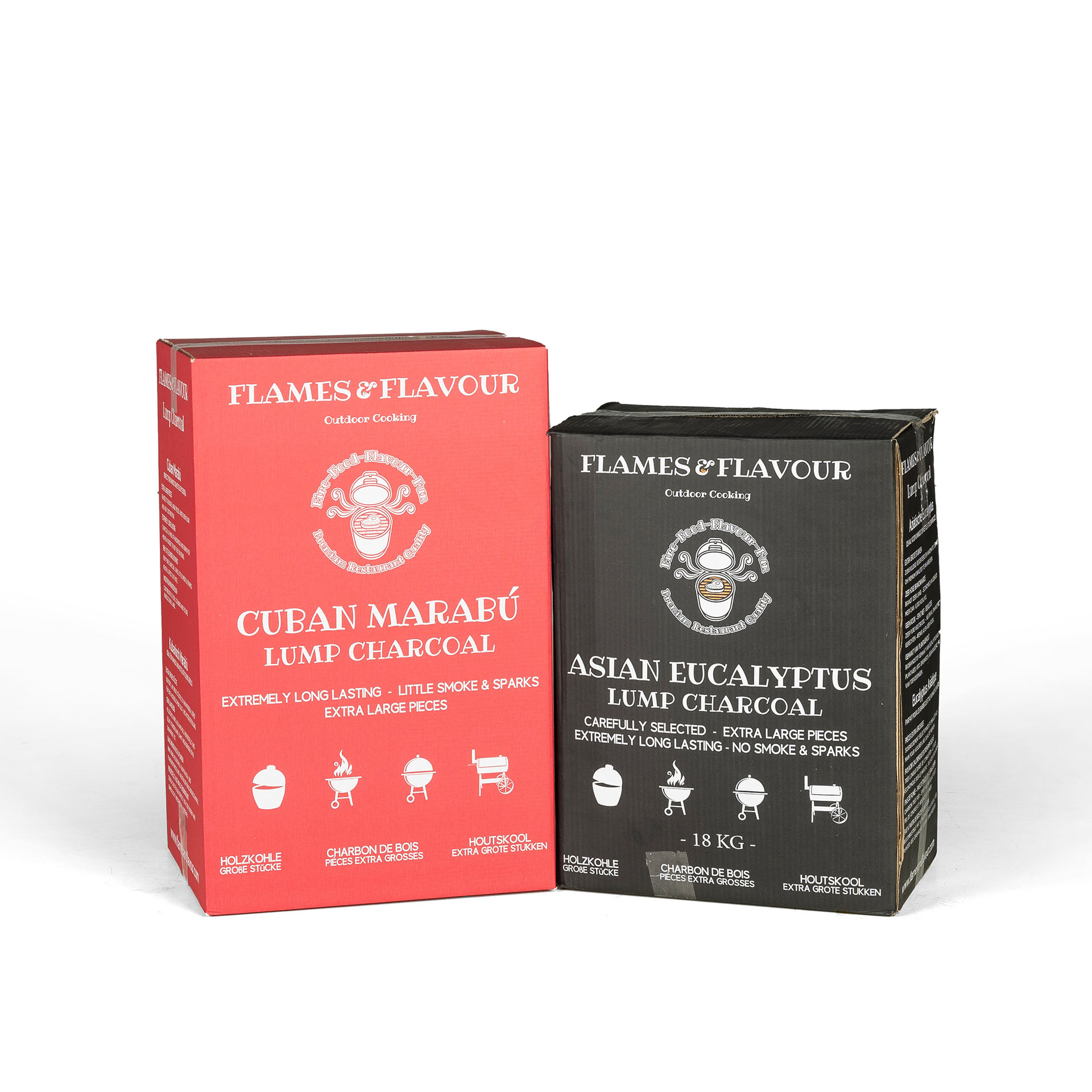 In deze aanbieding de twee hardhout houtskoolsoorten van Flames & Flavour. De zwaardere soorten met een lange brandduur en hoge temperaturen.