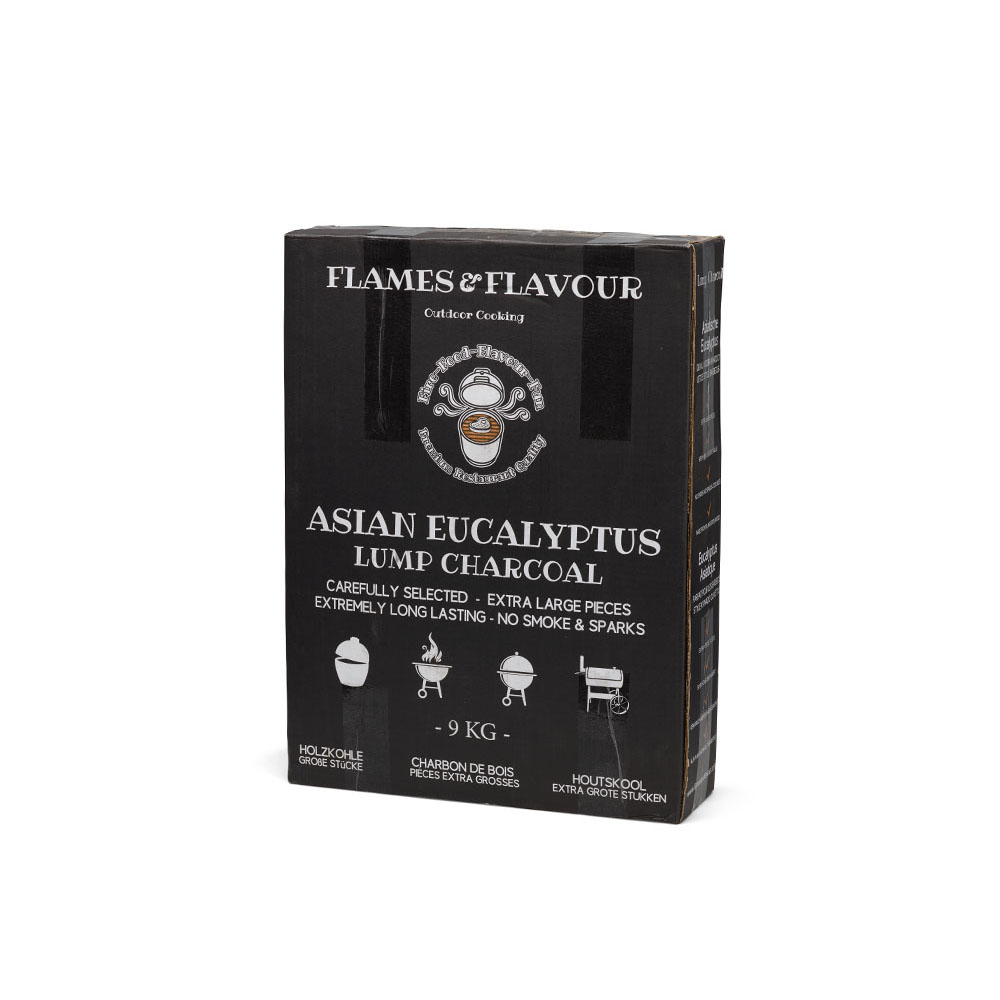Aziatische Big Block Eucalyptus Houtskool is de perfecte combinatie van hoge kwaliteit houtskool (> 80% koolstof!) en handmatige sortering. Ben je op zoek naar Big Block houtskool zonder rooksmaak en die lang brandt? Zoek niet verder. De hoge kwaliteit van de houtskool wordt bereikt door het eucalyptus hout gedurende vele dagen in traditionele klei-ovens te verwarmen. Door het geleidelijke proces behoudt het hout zijn oorspronkelijk vorm en wordt zeer pure houtskool gemaakt. Na het afkoelen worden speciaal voor Flames & Flavour de dozen met stukken Big Block Houtskool handmatig gevuld. Hierdoor wordt de allerhoogste kwaliteit in sortering bereikt. Ieder stuk is perfecte houtskool.