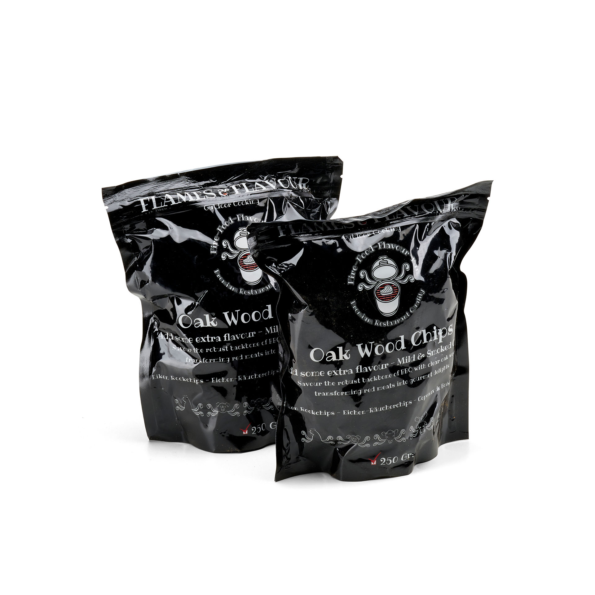 Flames & Flavour eiken rookhout komt in een handzame hersluitbare zak. De inhoud is 250gr per zak. Per zakje kan je 3-4 keer mee roken op je Big Green Egg – Kamado of Kettle BBQ.