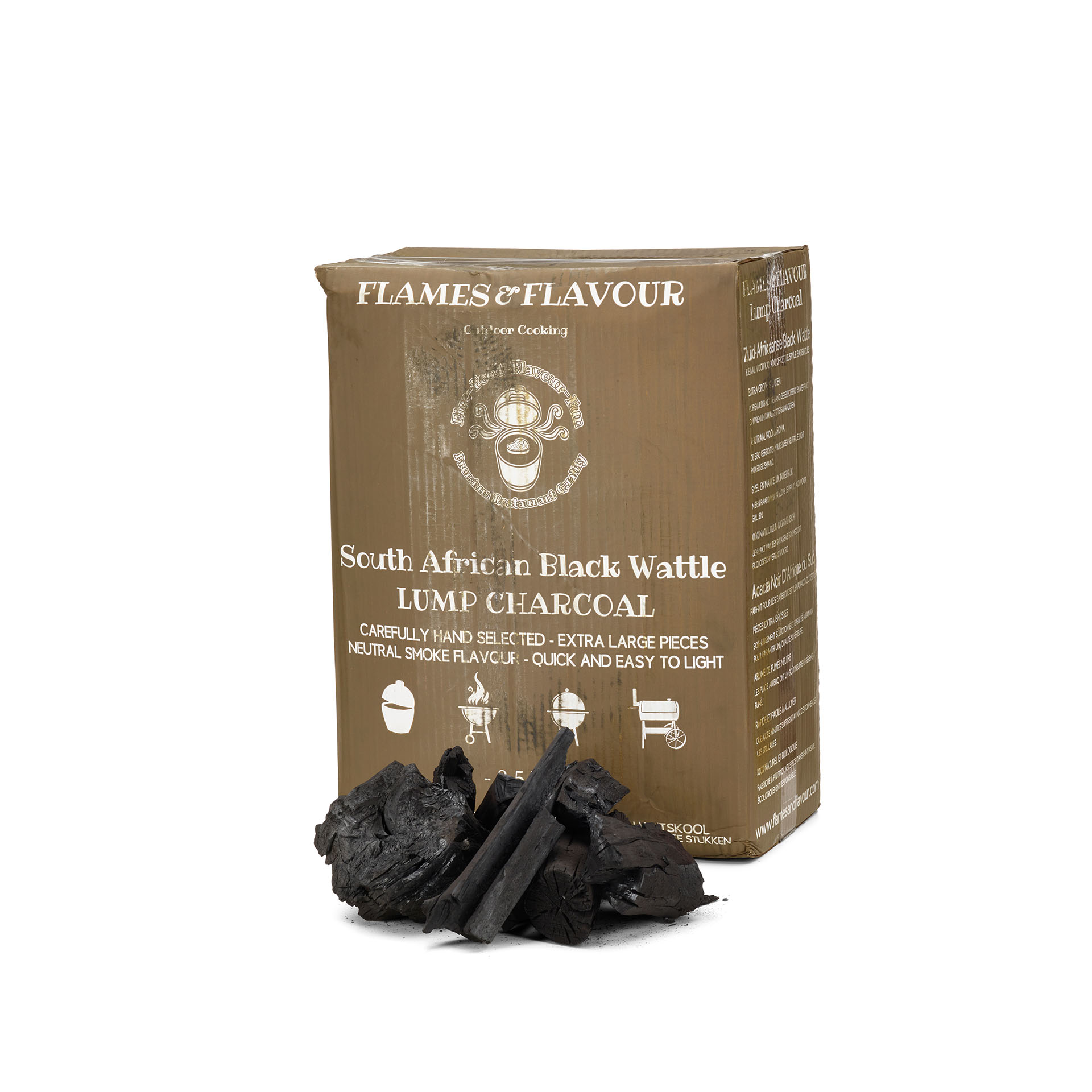 Deze black wattle kent een grove sortering van 7 cm en groter. Het is een hele mooie houtskool van hoge kwaliteit met prettige brandeigenschappen. Deze soort (Black Wattle Houtskool) is in Nederland bekend door Dammers Houtskool. Dammers heeft een minder grove sortering (rond de 5 cm). De Flames & Flavour Black Wattle wordt in Zuid Afrika zorgvuldig handmatig in de doos verpakt. Hierdoor wordt breuk tijdens het transport voorkomen.